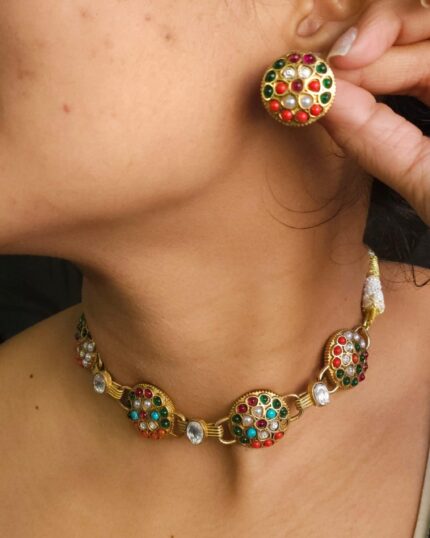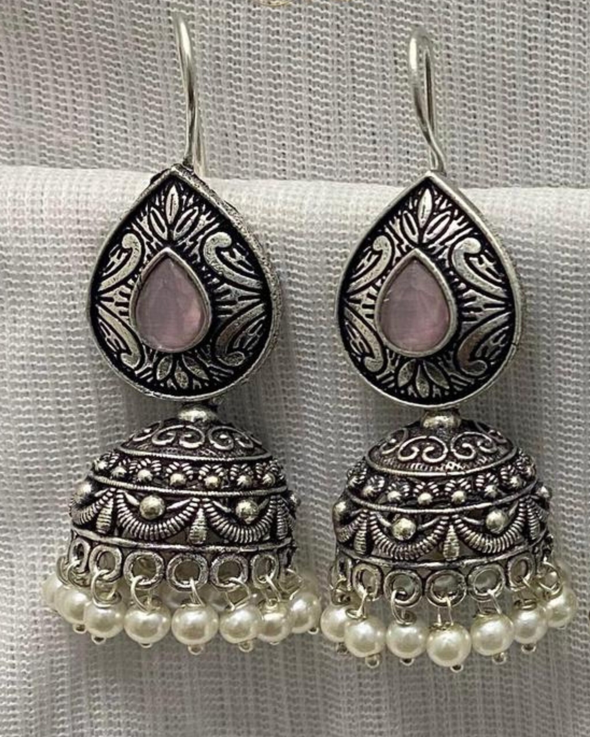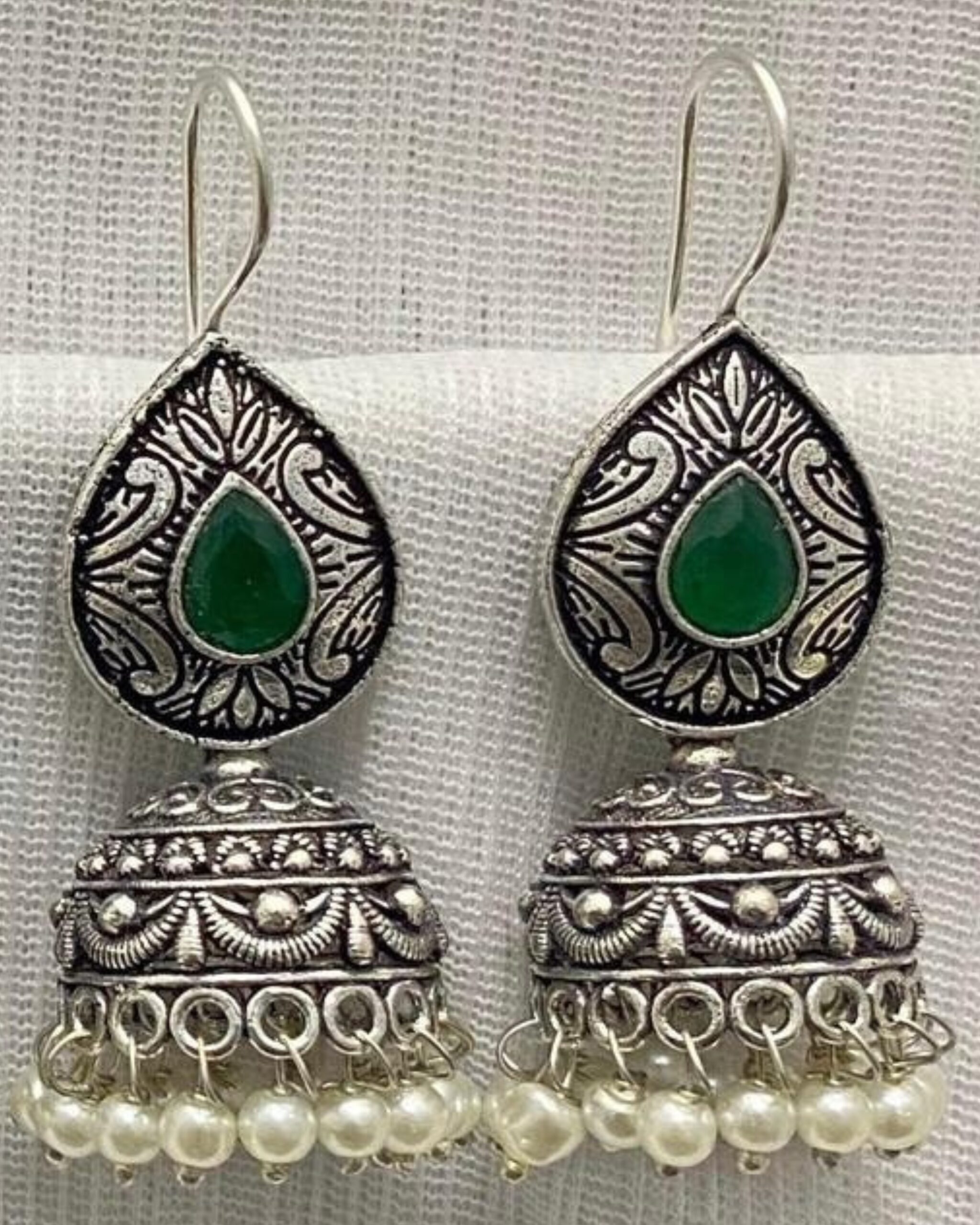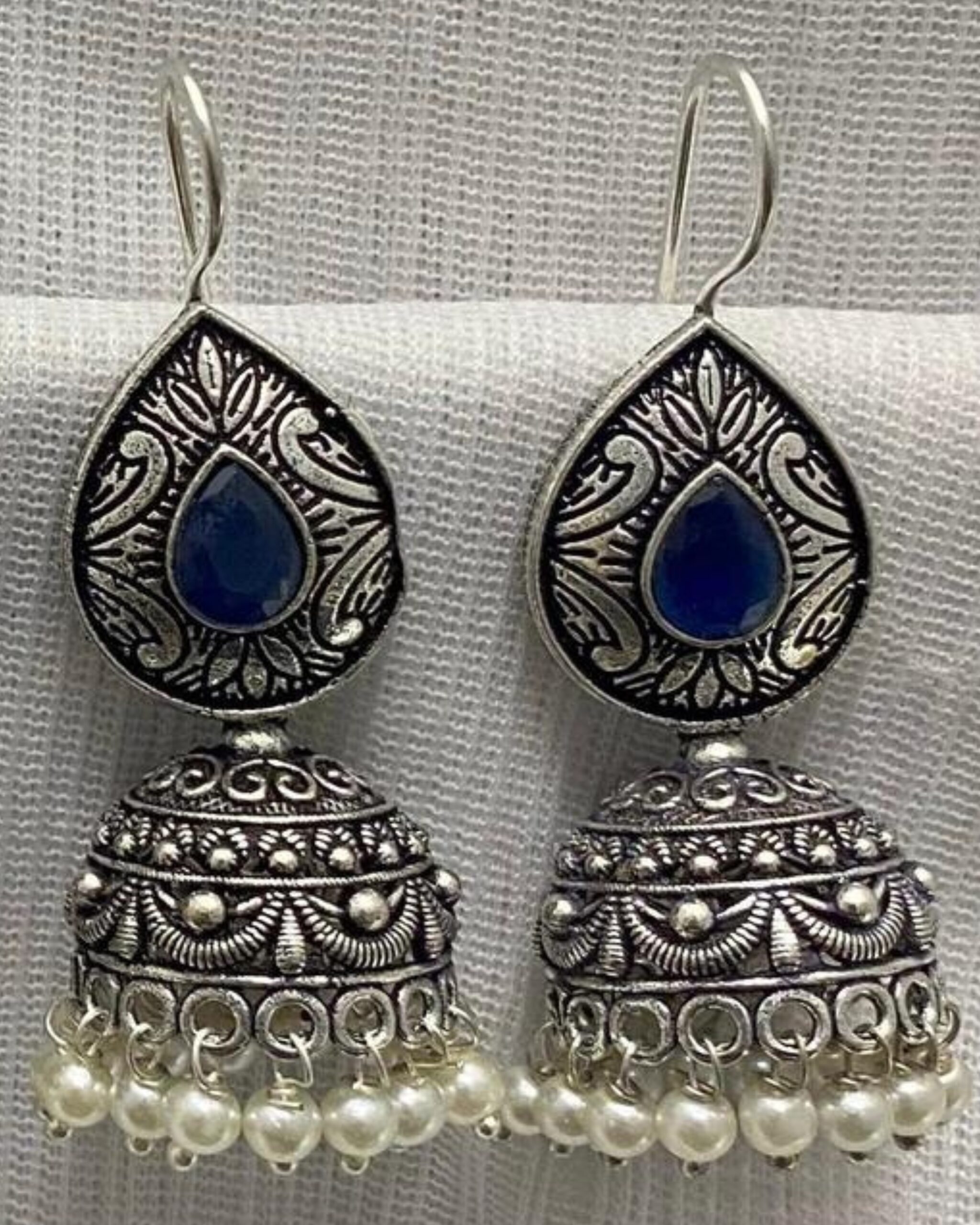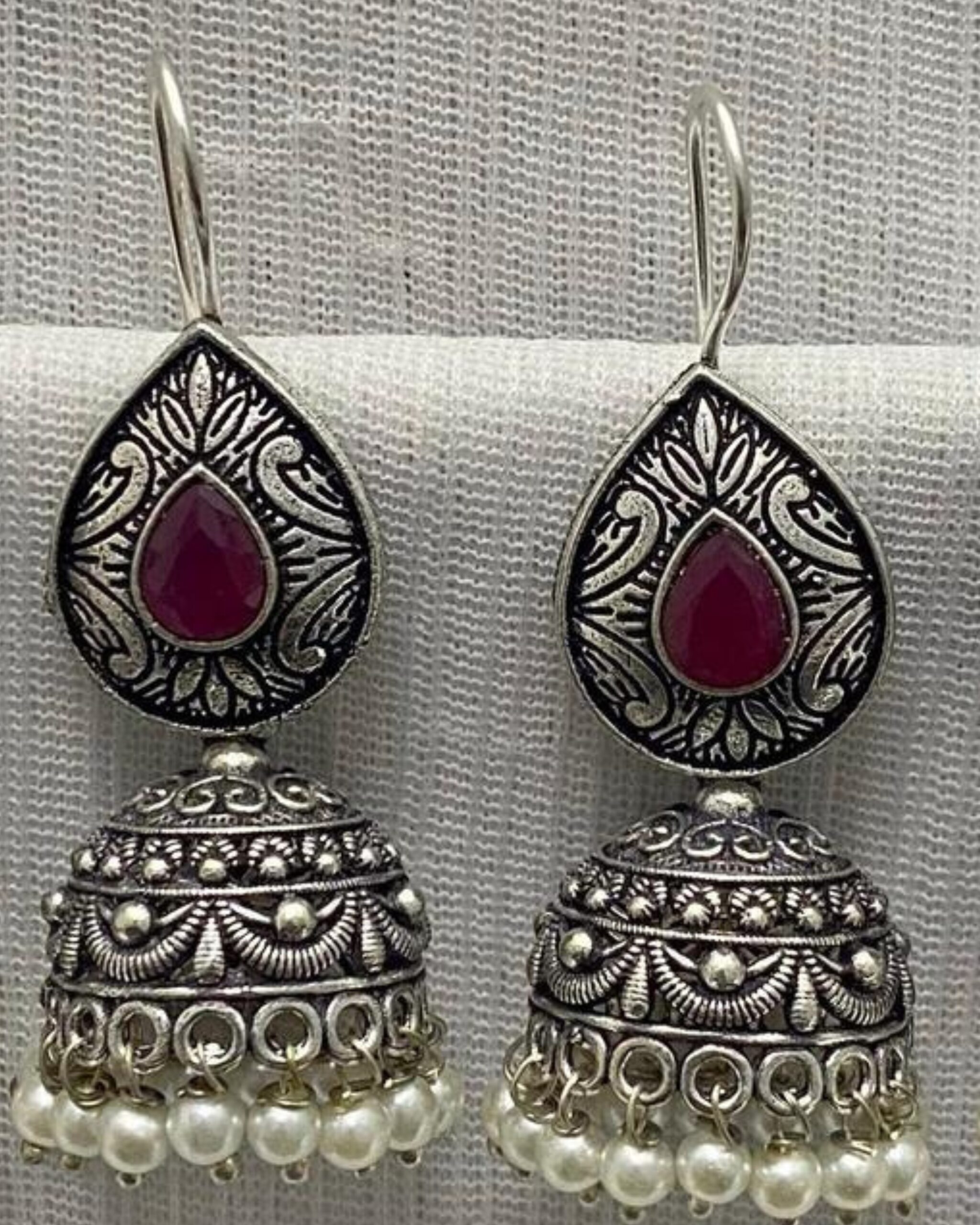 Be the first to review “Antique Silver-Plated Jhumka Earrings with Colored Gemstone Accent”