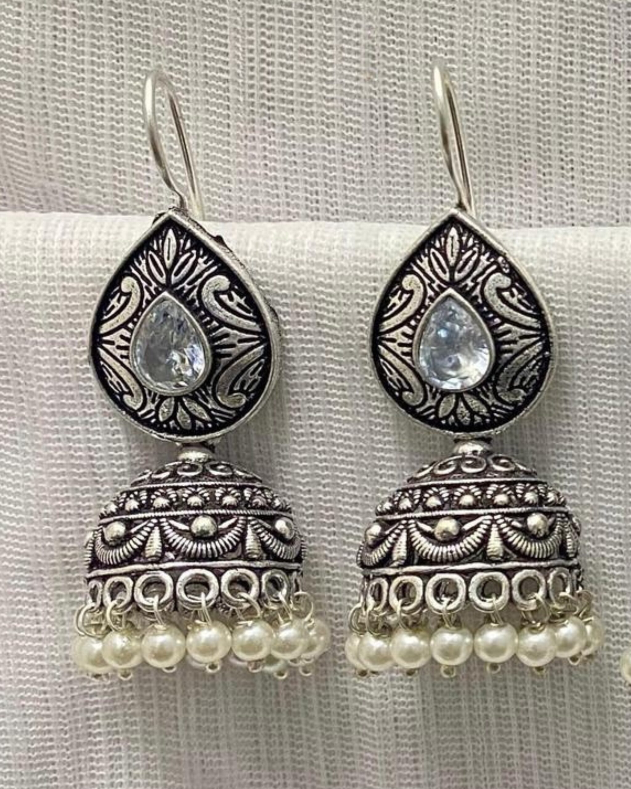The dome-shaped jhumkas are crafted with fine filigree detailing and finished with delicate pearl bead hangings that sway gracefully with movement. Whether it’s for a festive celebration, wedding function, or casual ethnic wear, these jhumkas blend traditional charm with regal sophistication.